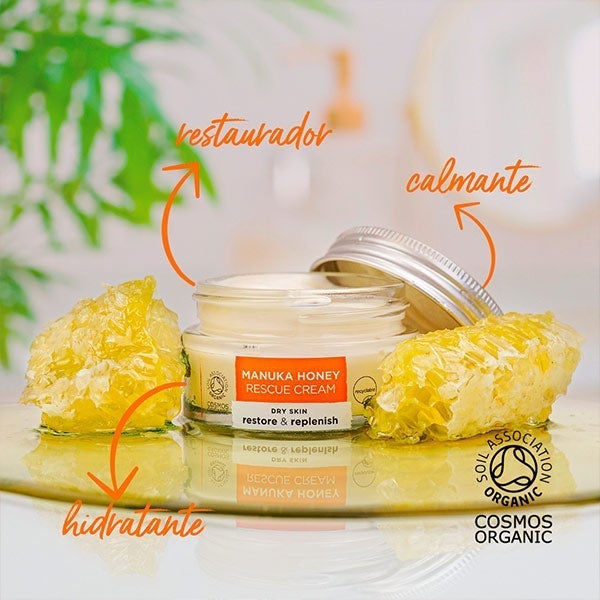 Crema de rescate con miel de manuka orgánica, apta para vegetarianos.