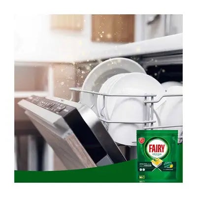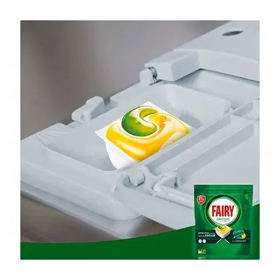 Disfruta de una limpieza superior y platos relucientes con Fairy Original Todo En Uno Cápsulas De Lavavajillas, Limón, Cápsulas Efectivas Incluso En La Grasa Reseca.