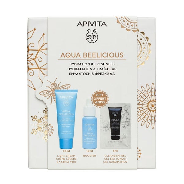 El set Aqua Beelicious de Apivita reúne tres productos concebidos para el cuidado facial completo. Contiene la crema-gel hidratante oil free Aqua Beelicious, que aporta frescor e hidratación, ayudando a equilibrar el exceso de sebo y dejando un efecto mate en la piel. Además, incorpora un booster hidratante y revitalizante en formato especial, que contribuye a suavizar y fortalecer la piel. También incluye el gel limpiador Black Detox con carbón activo y propóleo, que limpia rostro y ojos de manera eficaz sin provocar sequedad. Está enfocado a mujeres que desean prevenir y reducir las primeras líneas de expresión.