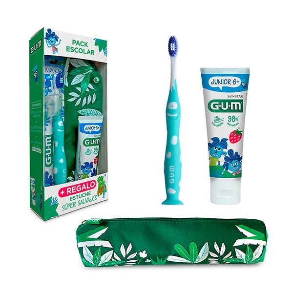 Contiene un cepillo dental y una pasta de dientes GUM JUNIOR pensados para niños a partir de 6 años, junto con un práctico estuche que facilita llevarlos siempre contigo.