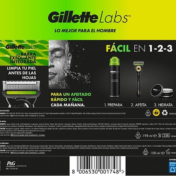 GILLETTELABS Gel de Afeitar con Espuma Rápida: extiende el producto, aféitate y enjuaga. Para un resultado rápido, práctico y con una sensación de frescor, o si deseas reproducir el efecto de una toalla caliente, utiliza este gel junto con las maquinillas GilletteLabs.