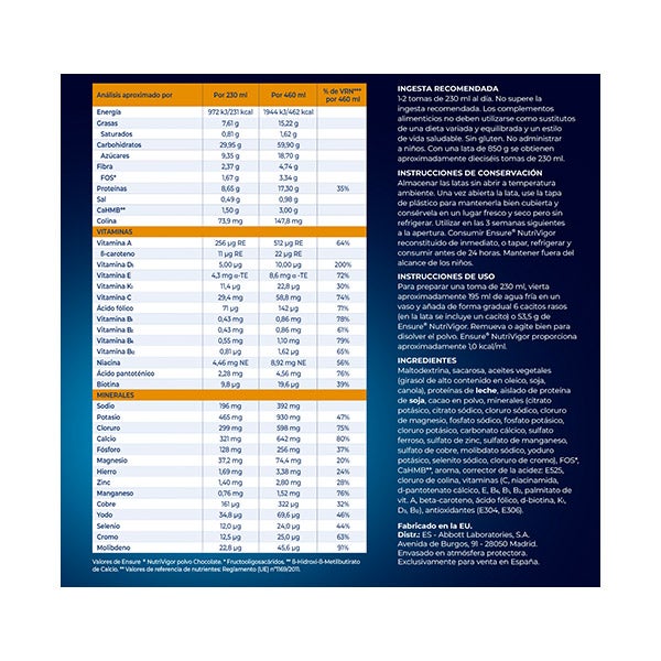 Maltodextrina, sacarosa, aceites vegetales (girasol de alto contenido en oleico, soja, canola), proteínas de leche, aislado de proteína de soja, cacao en polvo, minerales (citrato potásico, citrato sódico, cloruro sódico, cloruro de magnesio, fosfato sódico, fosfato potásico, cloruro potásico, carbonato cálcico, sulfato ferroso, sulfato de zinc, sulfato de manganeso, sulfato de cobre, molibdato sódico, yoduro potásico, selenito sódico, cloruro de cromo), FOS*, CaHMB**, aroma, corrector de acidez: ES25, cloruro de colina, vitaminas (C, niacinamida, d-pantotenato cálcico, E, B6, B1, B2, palmitato de vit. A, beta-caroteno, ácido fólico, d-biotina, K1, D3, B12), antioxidantes (E304, E306).