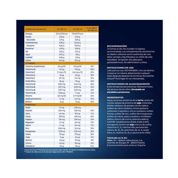 Producto listo para consumir. AGITAR BIEN antes de usar. Una vez abierto, mantener en refrigeración y desechar cualquier resto tras 24 horas. No calentar Ensure Nutrivigor en el microondas.