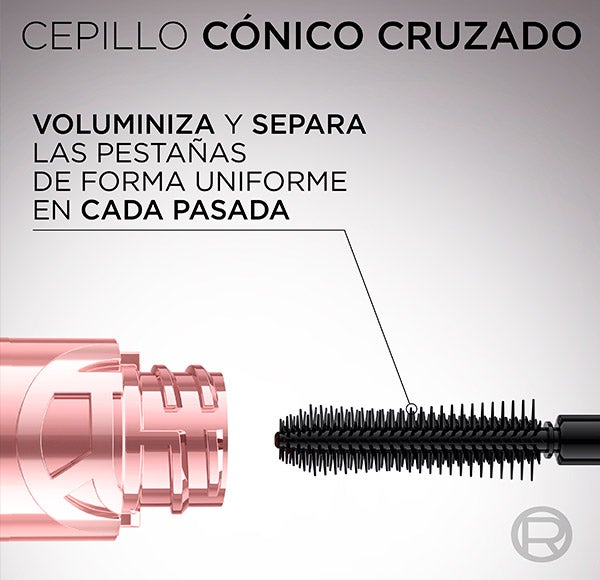 Su cepillo cónico entrecruzado, diseñado para aportar densidad y definición, envuelve cada pestaña proporcionando amplitud y extensión desde la primera pasada.