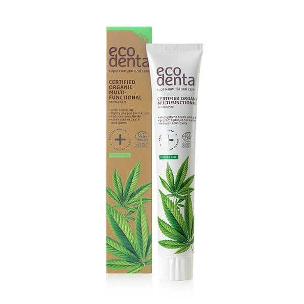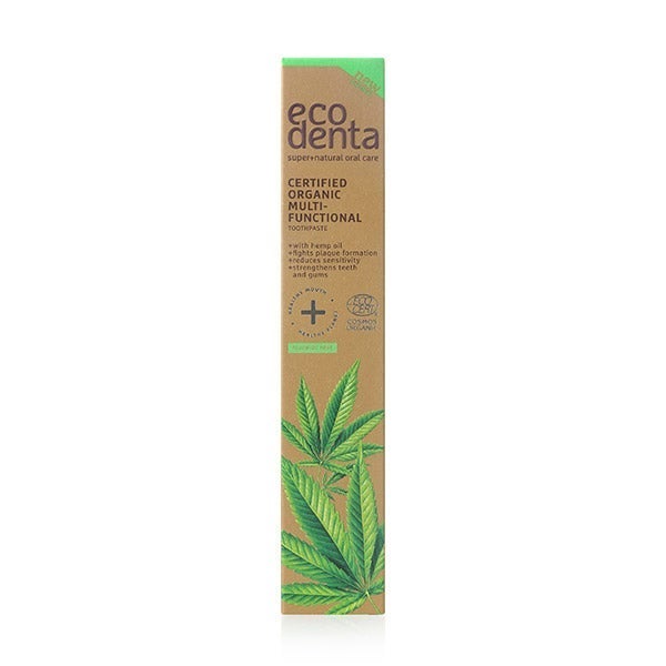 Pasta dental ecológica de acción integral con aceite de cáñamo natural.