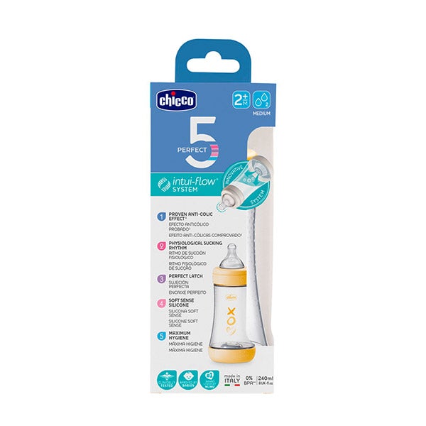 Biberón Perfect5 es un biberón biofuncional innovador de Chicco, concebido para reconocer y ajustarse al ritmo natural de succión de cada bebé o recién nacido. Su avanzada tecnología une la tetina Physio con la Membrana Equilibrium, que se adapta a la intensidad de succión del pequeño y ayuda a evitar la entrada de aire y la aparición de cólicos. La tetina Physio, fabricada en silicona con acabado Soft Sense, ofrece una textura suave y placentera al tacto, proporcionando una experiencia similar a la lactancia materna. El flujo continuo de la leche garantiza una sensación natural sin importar la fuerza de succión del bebé. Su base inferior desmontable permite desenroscarla con facilidad, simplificando la limpieza completa de cada pieza del biberón.