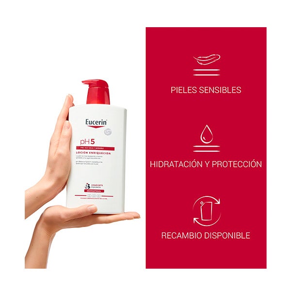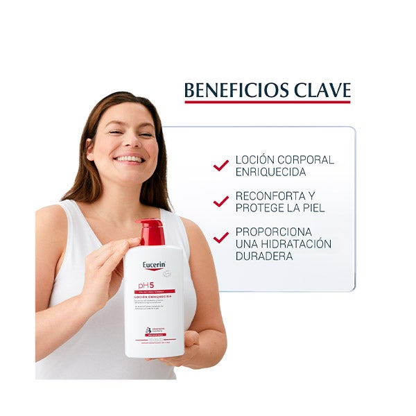 Eucerin pH5 Loción Enriquecida Corporal F es adecuada para pieles con tendencia a alergias tipo 1, como la rinitis alérgica, y también puede emplearse en niños mayores de tres años. Antes de introducir un nuevo producto en la rutina, realiza una pequeña prueba aplicándolo en la parte interna del codo.