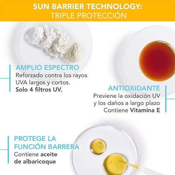 - Protección solar dermatológica triple, impulsada por la patente SUN BARRIER TECHNOLOGY.