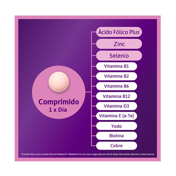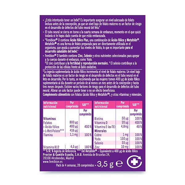 Los complementos alimenticios de Femibion® no deben emplearse como reemplazo de una alimentación variada, equilibrada y un estilo de vida saludable. No exceder la cantidad diaria recomendada (1 comprimido de Femibion 0).