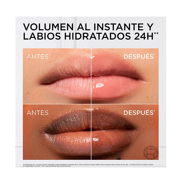 El aceite labial Plump Ambition de L'Oréal Paris hidrata y aporta brillo y volumen a los labios en cada uso. Su fórmula, con ácido hialurónico y tripéptidos, proporciona una hidratación que se mantiene durante 24 horas (*test instrumental en 24 voluntarias). Después de 4 semanas, los labios se ven más carnosos y atractivos (*test de consumidor en 113 mujeres). Disponible en 8 tonos.