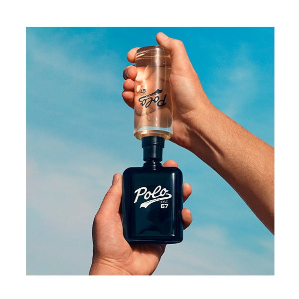 El frasco recargable en azul profundo destaca por el clásico logotipo Polo 67 en blanco. Una tapadera azul metálica completa este elegante y emblemático diseño.
