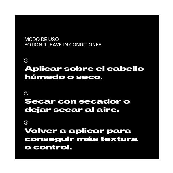 Distribuir Potion 9 sobre el cabello húmedo o seco. Dejar secar al aire o secar con secador. Aplicar calor para redefinir ondas o rizos. Volver a aplicar en seco para conseguir más textura y dominio.