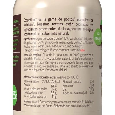 ECO POTITO VERDURAS DE LA HUERTA CON POLLO DEL CORRAL de 235 g. Este potito ecológico combina pollo, zanahoria, arroz y guisantes, ofreciendo una fuente natural de Omega 3 para bebés a partir de 6 meses. Producto reconocido como 100 % orgánico, con certificación de la Comunidad Europea y la Comunidad de Madrid.