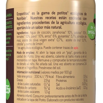 ECO POTITO VERDURAS HUERTA PAVO 235 G. En Nutribén® continuamos avanzando para responder a las expectativas de las familias, y por ello lanzamos la línea exclusiva de Eco Potitos®. ¡Los únicos que contienen omega 3!