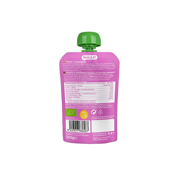 Ingredienes: Puré de manzana (35%), yogur girego (leche pasteurizada de vaca, nata, fermentos lácticos)(35%), puré de plátano (14,5%), puré de frambuesa (13%), harina de arroz (2,5%).