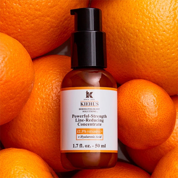 Powerful-Strength Line-Reducing Concentrate Serum, el sérum facial con 12,5% de Vitamina C de Kiehl's, contribuye a suavizar las arrugas, protege frente a los agentes externos y al envejecimiento prematuro (gracias a su duradera acción antioxidante) y favorece la producción natural de colágeno y elastina, con mayor actividad durante la noche.