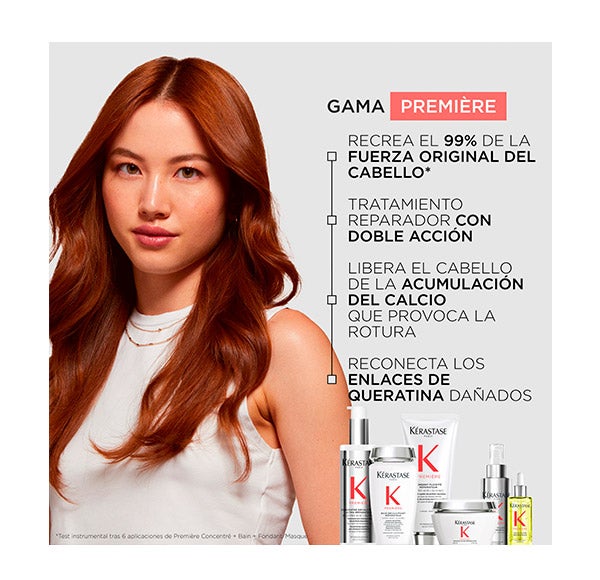 La colección Première, con su doble poder reparador, interrumpe el ciclo del daño continuo en el cabello descalcificado, aporta hasta un +97% de fortaleza interna, reproduce el 99% de su resistencia original* y garantiza la penetración óptima de sus activos en el corazón de la fibra para reducir el deterioro tanto interno como superficial.