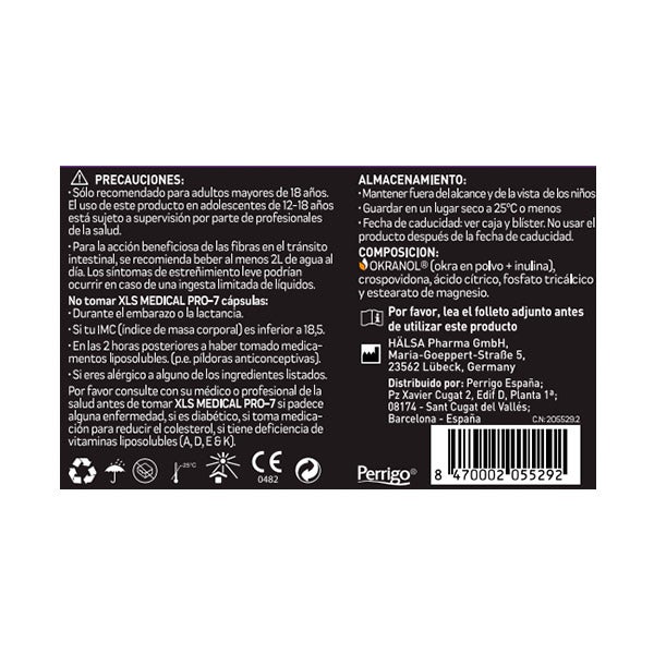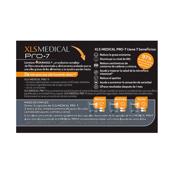 Ingerir 2 cápsulas de XLS MEDICAL PRO-7, tres veces al día, justo después de cada comida principal (desayuno, comida y cena).