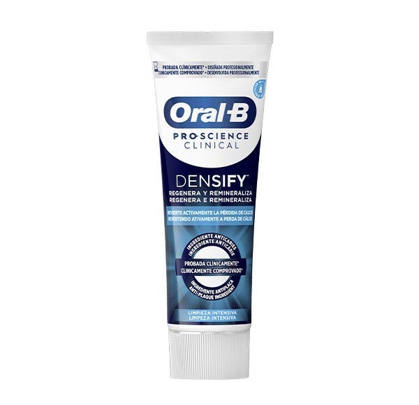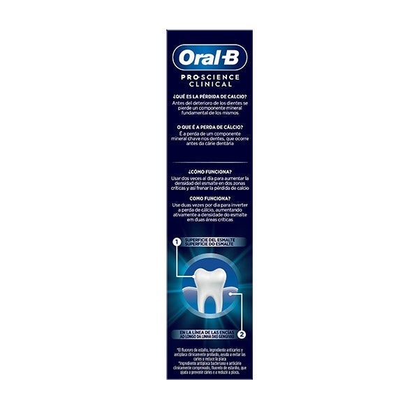 La pasta dentífrica Oral-B Pro-Science Clinical, cuando se emplea dos veces al día, contribuye a recuperar el calcio perdido fortaleciendo la densidad del esmalte en dos zonas fundamentales: la capa externa del esmalte y el borde de las encías.