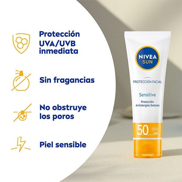 NIVEA SUN Protección Facial UV Sensitive FP50 ha sido formulado de manera específica para cuidar la piel sensible del rostro. Este protector solar brinda defensa externa frente a los rayos UVA/UVB y la Luz Visible de Alta Energía, factores que contribuyen al envejecimiento prematuro. Al mismo tiempo, impulsa la protección natural desde el interior gracias a un antioxidante de origen natural que activa los mecanismos defensivos propios de la piel. Su textura ligera y sin fragancia ha sido diseñada especialmente para pieles sensibles, ayudando a evitar irritaciones y reacciones solares. Perfecto para incluirlo en la rutina diaria.