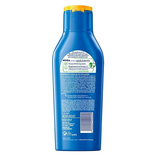 NIVEA SUN Protege & Hidrata Loción Solar FP50+ cuida la piel tanto por fuera como por dentro. Proporciona defensa frente a los rayos UVA/UVB, evitando quemaduras solares y signos de envejecimiento prematuro, al tiempo que refuerza la protección cutánea interna gracias a la acción antioxidante de la Vitamina E, que ayuda a activar las defensas naturales de la piel. Además, ofrece hidratación continua durante 48 horas.