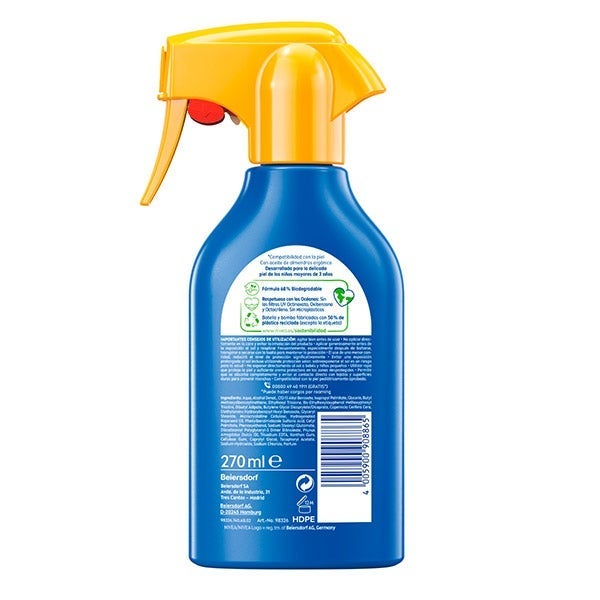 NIVEA SUN Kids Protege & Cuida Spray Solar FP50+ ofrece una defensa inmediata y eficaz frente a los rayos UVA/UVB, ayudando a evitar quemaduras y daños cutáneos a largo plazo. Su fórmula, creada específicamente para la piel sensible de los niños, refuerza la barrera natural de la piel y brinda hidratación prolongada, contribuyendo a minimizar la aparición de alergias solares.