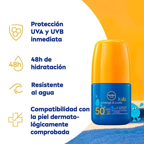NIVEA SUN Protege & Juega Roll-on Solar Niños FP50+ presenta un formato innovador que hace que la aplicación sea fácil, rápida y entretenida para los más pequeños.