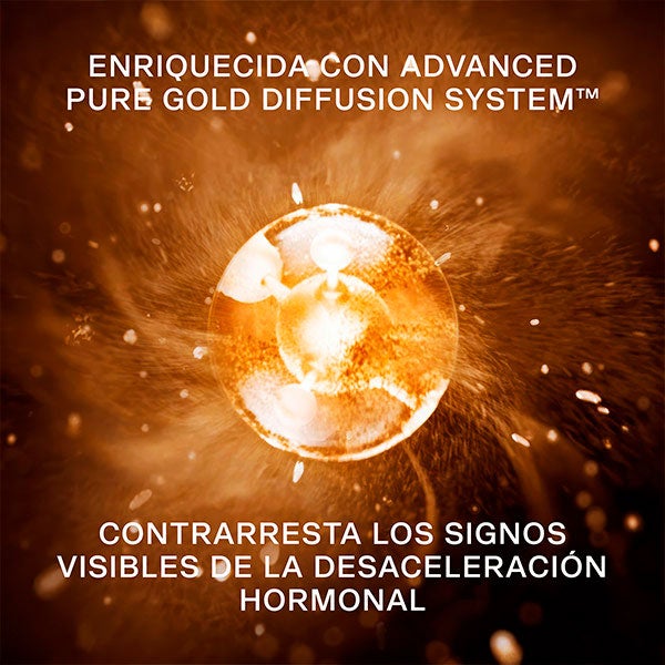 Aporta hidratación profunda y bienestar, al mismo tiempo que revitaliza y renueva la piel. Gracias a su contenido de Exclusive Cellular Complex™, Pure Gold y Peptide Powered Meno Complex, actúa sobre la piel afectada por los procesos de envejecimiento, incluyendo aquellos originados por desequilibrios hormonales. Esta esencia, formulada con The Pure Gold Diffusion System™, ha sido concebida para activar mecanismos que fortalecen la estructura cutánea, compensar los signos visibles derivados de los cambios hormonales y distribuir componentes restauradores que mantienen la hidratación y optimizan el confort. The Pure Gold Diffusion System™ colabora en recuperar la densidad de la piel, ayudando a restaurar el colágeno perdido y a protegerlo de su degradación. Al mismo tiempo, refuerza la barrera cutánea para conservar la humedad y devolver sensación de confort.