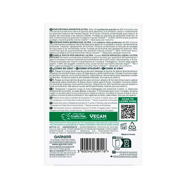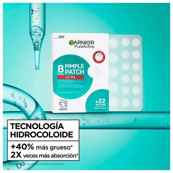 Evaluación clínica de la visibilidad de granos realizada en 111 granos, 47 voluntarios, tras una única aplicación. *Comparado con Garnier Invisible Pimple Patch. ***Prueba de consumidores en 58 participantes.