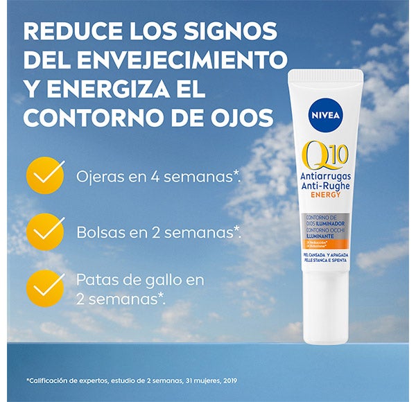 NIVEA Q10 ENERGY Contorno de Ojos Energizante ayuda a disminuir las arrugas y a revitalizar la piel que rodea los ojos. Su fórmula exclusiva ha sido creada para cuidar esta zona particularmente delicada. Atenúa de forma visible las patas de gallo hasta en un 84% y mejora la firmeza del contorno. Además, contribuye a reducir las ojeras. Contiene Coenzima Q10 de doble acción, 100% idéntica a la presente en la piel, que protege las células frente a agentes externos y recarga la piel de energía para favorecer su regeneración*. La Creatina impulsa las fibras reafirmantes cutáneas*. Probado dermatológica y oftalmológicamente, es adecuado para quienes usan lentes de contacto. *in‑vitro ^Estudio de 2 semanas, 31 mujeres, 2019