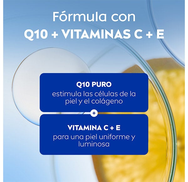 Para obtener mejores resultados, utiliza junto con la crema de noche NIVEA Q10 ENERGY Crema de Noche Iluminadora.