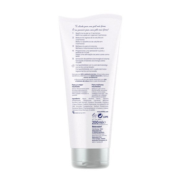 NIVEA Q10 MULTI POWER 5in1 Gel-Crema Anticelulítico + Reafirmante ayuda a que la piel luzca más firme en tan solo 2 semanas, aumentando su elasticidad y tonicidad mientras atenúa los signos visibles de la celulitis en 3 semanas. Su fórmula, con Coenzima Q10 y Extracto de Loto, fomenta la renovación celular y favorece la conversión de la grasa en energía. La textura en Gel-Crema de este anticelulítico de NIVEA se absorbe con rapidez, aportando un efecto refrescante inmediato y dejando la piel suave, sedosa y revitalizada. Obtén una piel más lisa y con aspecto firme gracias a este gel-crema anticelulítico. Compatibilidad cutánea dermatológicamente comprobada.