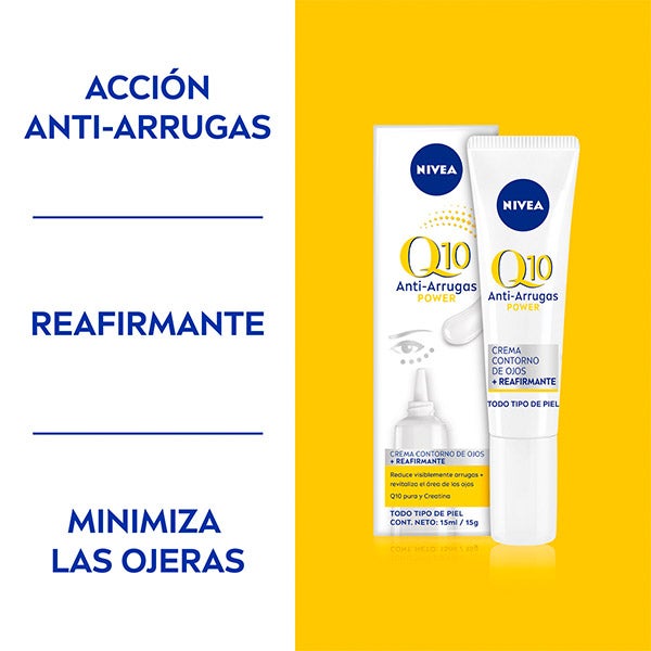 NIVEA Q10 Antiarrugas Power Contorno de Ojos ayuda a suavizar las líneas de expresión y reenergizar la piel alrededor de los ojos. Su fórmula exclusiva ha sido creada especialmente para cuidar la frágil zona del contorno ocular. Disminuye visiblemente las patas de gallo en un 17%^ y proporciona una piel más firme y tonificada en esta área. Atenúa las ojeras hasta en un 33%^. Está enriquecida con Coenzima Q10 de doble acción, completamente idéntica a la que produce la piel, que protege las células frente a los factores externos y renueva la energía cutánea, favoreciendo su regeneración*. La Creatina potencia las fibras que brindan firmeza a la piel*.