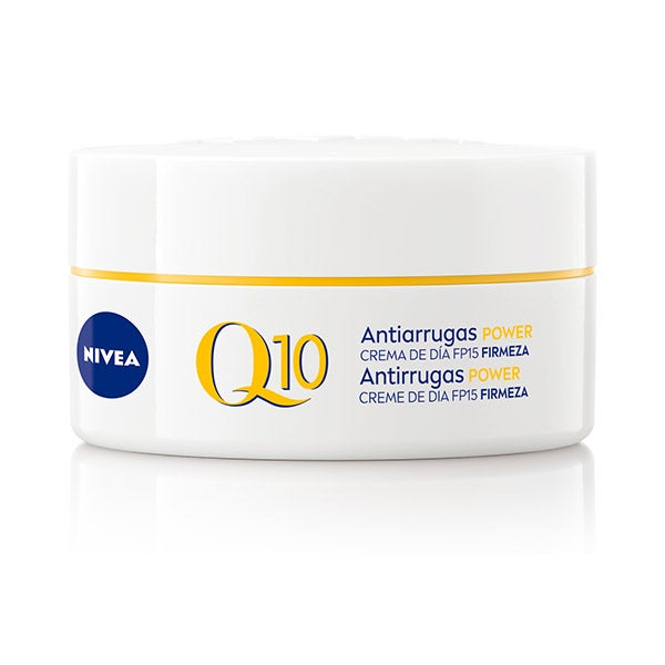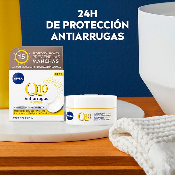 NIVEA Q10 Antiarrugas POWER Crema de Día FP15 incorpora coenzima Q10, idéntica a la natural de la piel, para brindar una acción antiarrugas de hasta 24 horas. Ayuda a proteger las células cutáneas frente al estrés oxidativo y los factores externos*, aportando energía para contrarrestar los daños diarios y favorecer su regeneración*. Con el uso, la piel luce más firme y las arrugas se atenúan desde los primeros 7 días. Su fórmula con creatina impulsa la producción de fibras reafirmantes*. El FP15 contribuye a resguardar la piel de la radiación UVA/UVB. En 24 horas, la piel se nota más suave, nutrida y con aspecto saludable. En una semana, muestra un 21% más de firmeza y menos líneas de expresión**. A las 4 semanas, se observan mejoras continuas˜ y ayuda a prevenir nuevas arrugas. Dermatológicamente comprobado. in-vitro *Estudio de 1 semana con 47 mujeres, 2020. ~Estudio de 4 semanas con 38 mujeres, 2020