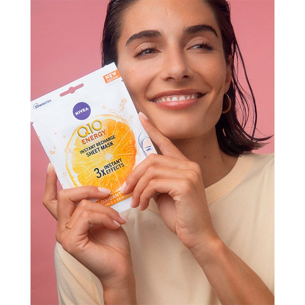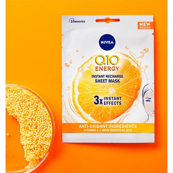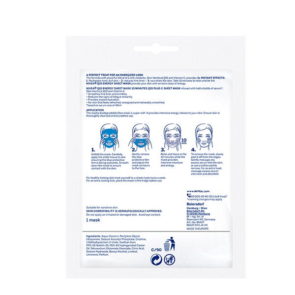 La mascarilla de tejido NIVEA Q10 ENERGY Tissue Mask Antiarrugas, enriquecida con coenzima Q10 y vitamina C, revitaliza al instante la piel con aspecto apagado o fatigado, otorgándole una sensación inmediata de energía. Su fórmula, con Q10 idéntica a la presente en la piel y vitamina C, combina dos antioxidantes altamente eficaces que actúan de forma visible en tres dimensiones: ayudan a reducir los signos de cansancio, suavizan arrugas y líneas de expresión y proporcionan nutrición al rostro. Cada mascarilla contiene una cantidad de ingredientes equivalente a medio frasco de sérum con coenzima Q10 y vitamina C*, dejando la piel más suave, luminosa, fresca y con un aspecto saludable en solo 10 minutos. Tómate un momento de relajación mientras esta mascarilla aporta la energía que tu piel necesita. Puede emplearse hasta dos veces por semana; si deseas potenciar la sensación de frescor, colócala en el refrigerador antes de aplicarla.