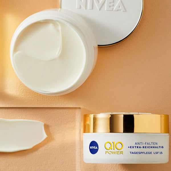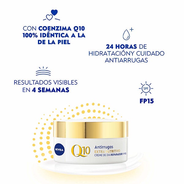 NIVEA Q10 Antiarrugas Crema de Día Extra-Nutritiva ha sido creada específicamente para responder a las necesidades de la piel seca y muy seca. Su fórmula con Coenzima Q10, idéntica al componente natural de la piel, actúa como fuente de energía y defensa antioxidante. Contribuye a proteger las células cutáneas frente a las agresiones externas y a revitalizarlas para mejorar su regeneración*. Además, el Aceite de Argán orgánico fortalece la barrera cutánea, aportando una nutrición intensa que se prolonga 24 horas. Ayuda a disminuir las arrugas marcadas en 4 semanas y a que la piel se vea más firme en tan solo 2. Su FP15 ofrece protección contra los rayos UVA/UVB. El resultado: una piel visiblemente más firme para el 97% de las mujeres** en dos semanas y arrugas profundas atenuadas en cuatro semanas. Probado dermatológicamente. in vitro *Estudio de 2 semanas con 33 mujeres, 2019.