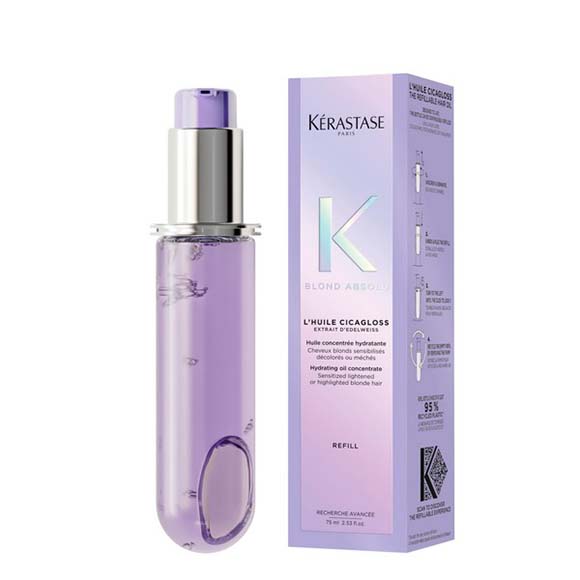 El aceite recargable Cicagloss brinda una nutrición intensa, refuerza la fibra capilar dañada y contribuye a la recuperación del cabello tras procesos de decoloración o aclarado, aportando un brillo inmediato. Formulado con Edelweiss, una flor de alta montaña que prospera a más de 3000 m en los Alpes suizos y resiste condiciones extremas como vientos fuertes, radiación UV y bajas temperaturas. Su delicada extracción conserva la fuerza reparadora de sus activos.