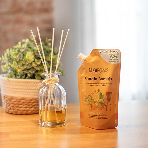 EKOMIKADO es una recarga para ambientador mikado que se presenta en un innovador formato doypack. Esta bolsa flexible ayuda a disminuir el uso de plástico y la huella de carbono frente a las recargas tradicionales en botella. Representa una apuesta conjunta por un consumo más sostenible y consciente. Su diseño te permite reutilizar el envase que prefieras para verter la fragancia, y está disponible en los cuatro aromas más populares de la gama.