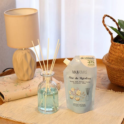 EKOMIKADO es una recarga para ambientador mikado que se presenta en un formato novedoso: una práctica bolsa doypack que ayuda a disminuir el uso de plástico y las emisiones de carbono, en comparación con los tradicionales envases de reposición en botella. Es la expresión de un compromiso compartido con un consumo más consciente y sostenible. Te permite elegir el recipiente donde colocar la fragancia y se ofrece en nuestros cuatro aromas más populares.
