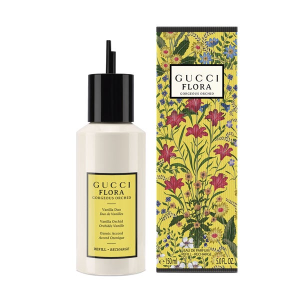 Cuando tu frasco esté vacío, simplemente desenrosca el vaporizador, coloca la recarga y espera a que se detenga automáticamente en 100 ml. Después, basta con quitar la recarga y volver a ajustar la bomba original. Solo cuatro sencillos pasos para revivir tu icónico frasco. Vive intensamente bajo tu propio estilo con Gucci Flora Gorgeous Orchid.
