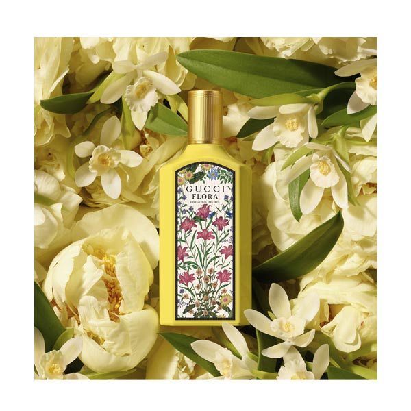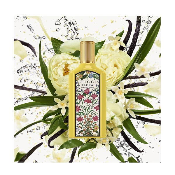 Alojada en un elegante frasco alto de aluminio blanco con un difusor negro brillante, la superficie frontal muestra el nombre y sus notas principales sobre un luminoso color amarillo enmarcado con un borde negro. El empaquetado exterior luce el emblemático motivo Gucci Flora, una auténtica explosión de florecimiento ilustrado realzado con el característico borde amarillo del frasco original.