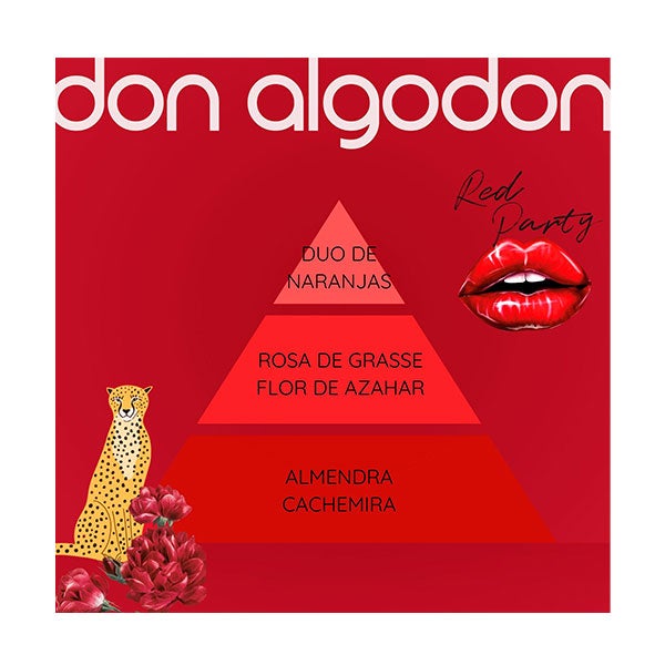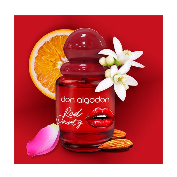 Déjate envolver por el encanto de Red Party de Don Algodón. Este perfume floral de 30 ml une la sensualidad del dúo de naranjas con la fuerza de la rosa de Grasse y el toque cálido de la almendra y el cachemir. Una fragancia cautivadora, ideal para mujeres que quieren brillar y sentirse irresistibles.