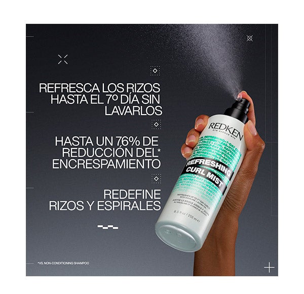 Redken Refreshing Curl Mist es un spray revitalizante especialmente formulado para el cabello rizado, que aporta hidratación prolongada y devuelve la energía a tus rizos entre cada lavado. Su composición exclusiva ayuda a conservar la frescura de los rizos hasta siete días.