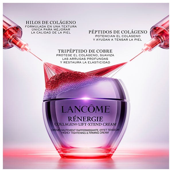 Explora una nueva era en la ciencia del colágeno con Lancôme Rénergie Collagen+ Lift-Xtend Cream, una crema facial antiedad avanzada inspirada en las técnicas de lifting con hilos tensores.