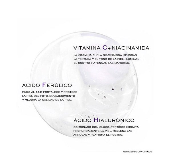 Vitamina C** + Niacinamida en una emulsión ligera con pH bajo para una acción más efectiva.