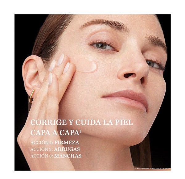 Actúa sobre la piel en diferentes niveles*** ofreciendo una triple acción que mejora la firmeza, suaviza arrugas y atenúa manchas, aportando máxima eficacia con una sensorialidad excepcional.