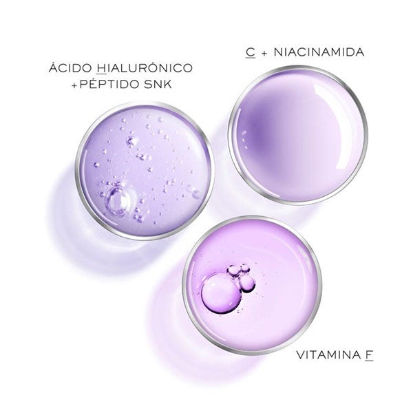 Tres potentes activos tradicionalmente difíciles de combinar, Ácido Hialurónico con péptido SNK, C* + Niacinamida y Vitamina F, se unen en una triple concentración.