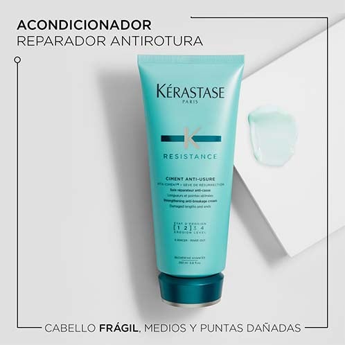 Ciment Anti-Usure es un acondicionador diseñado para fortalecer el cabello dañado y frágil. Su acción antirrotura ayuda a restaurar la estructura interna de la fibra capilar, ofreciendo una melena más firme y resistente día tras día.