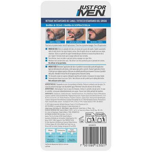 El tinte para barba y cejas Just for Men Retoque Instantáneo de canas es una coloración de aplicación rápida, sin necesidad de enjuague, que se aplica con brocha para disimular las canas de forma temporal y dar mayor densidad y definición a las zonas menos pobladas.