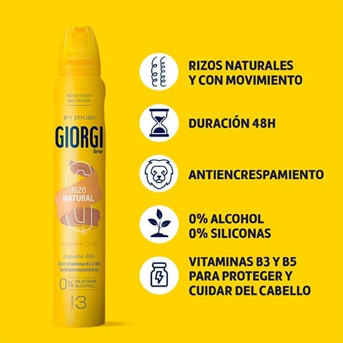 Descubre la Espuma Rizos Naturales de Giorgi, tu aliada para crear rizos suaves, con aspecto natural y movimiento durante 48 horas, sin frizz, gracias a sus componentes acondicionadores.